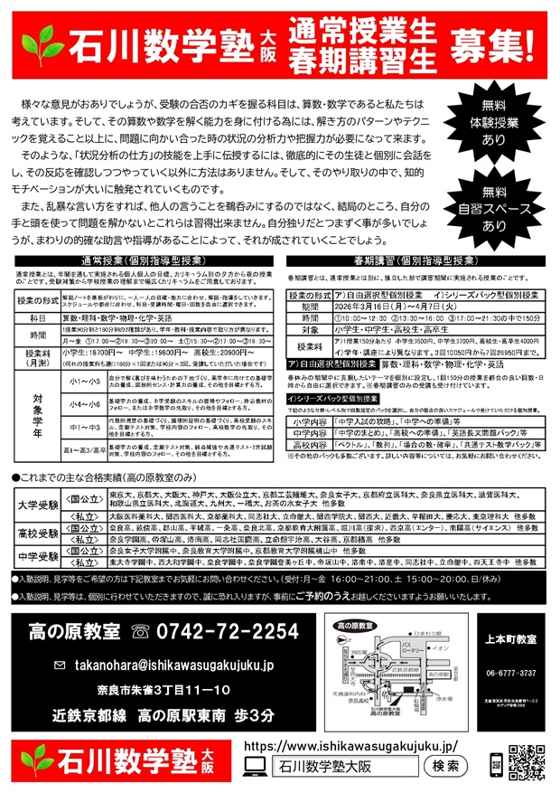 さて、本日は、通常授業生および春期講習生募集の